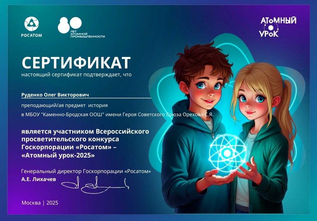 Учитель химии Руденко Олег Викторович провёл познавательный "Атомный урок" для детей старших классов. Ребята окунулись в атомный мир, познакомились с атомной индустрией и профессиями атомщиков.