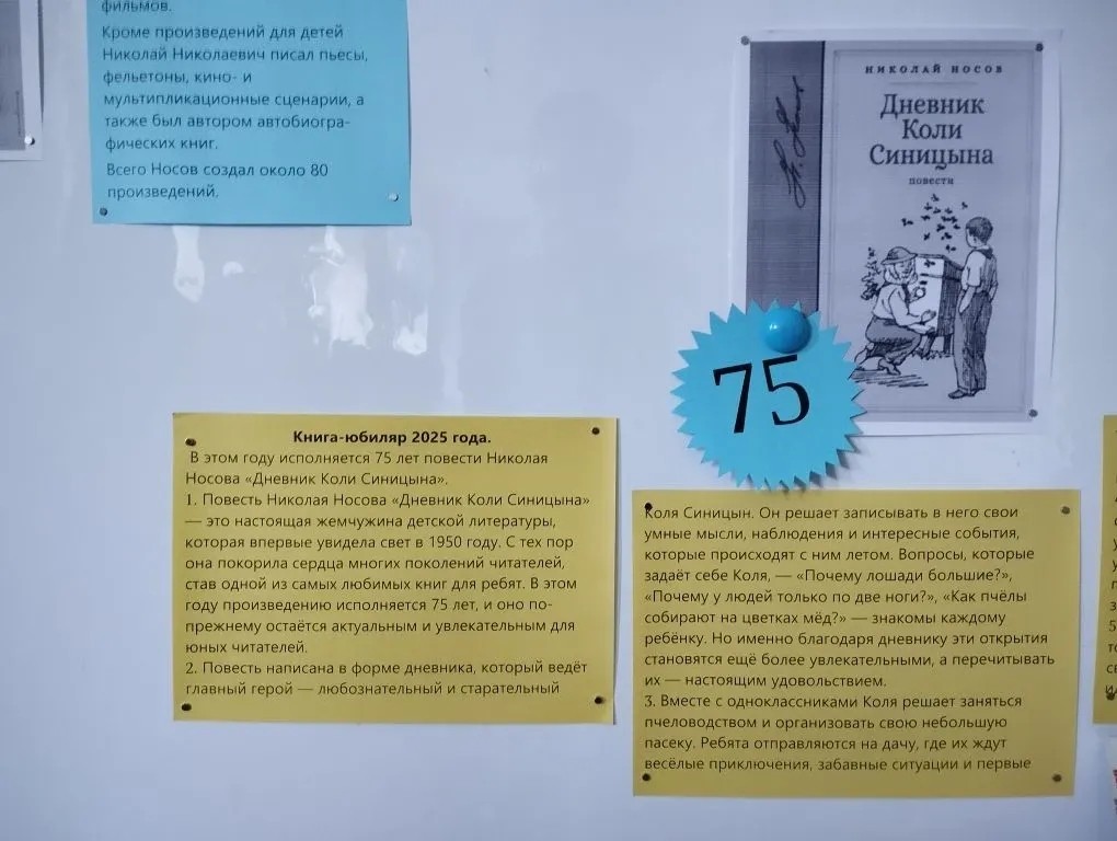 Тематическая выставка ко Дню рождения Н.Н.Носова и юбилею книги ,,Дневник Коли Синицина" . Выставку подготовил школьный педагог-библиотекарь Элеонора Анатольевна Черных.